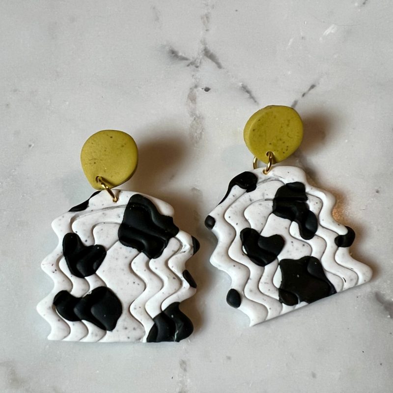 An abstract wavy pair with embossed wiggle detail, hanging from contrasting tops, made of super-light polymer clay. This pair measures 5.5cm by 3.5cm and comes on hypoallergenic posts.
